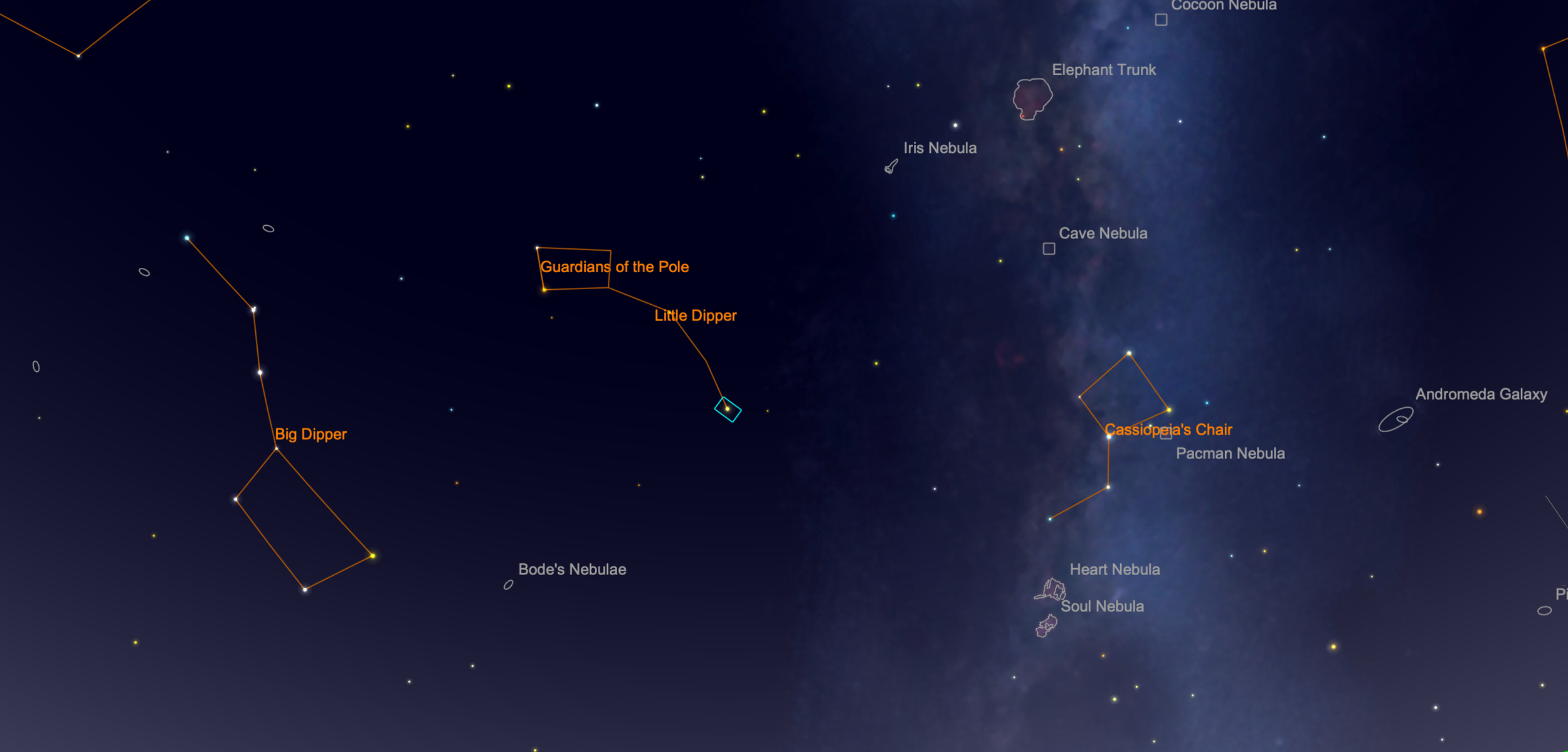 How can you find Andromeda? If you can find the Big Dipper, the front part of the dipper (pot) points to Polaris (the North Star), the “biggest” bright star in that part of the sky. Keep going past Polaris, about the same distance as the Big Dipper was, and you’ll find a W arrangement of stars - that’s Cassiopeia. Keep going in the same direction, not quite as far as Polaris to Cassiopeia, and you’ll hopefully see Andromeda as a smudge of faint light.